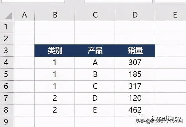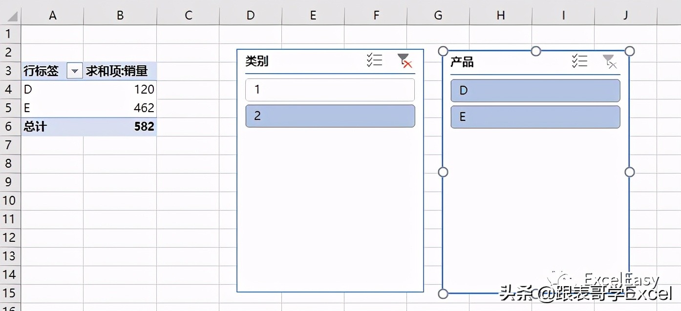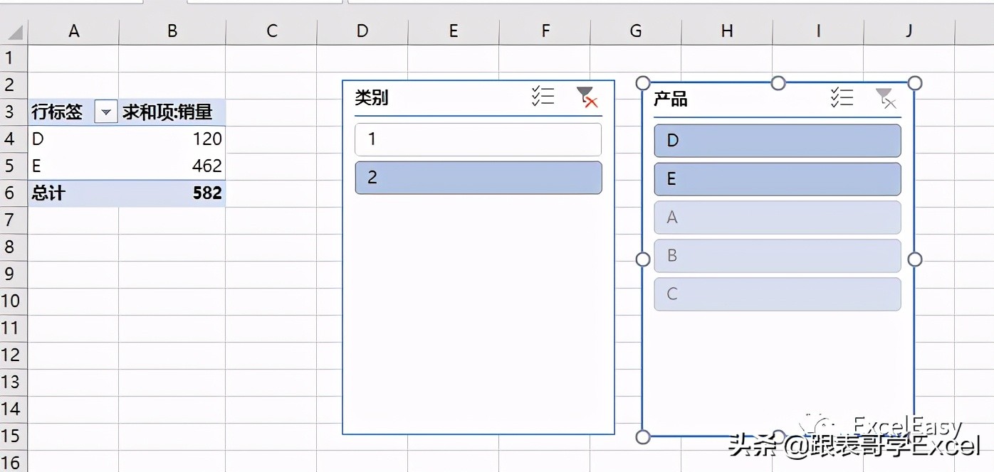 我们看到,选中类别2后,在产品切片器上,D、E被加亮显示,但是A、B、C仍然出现在列表中。