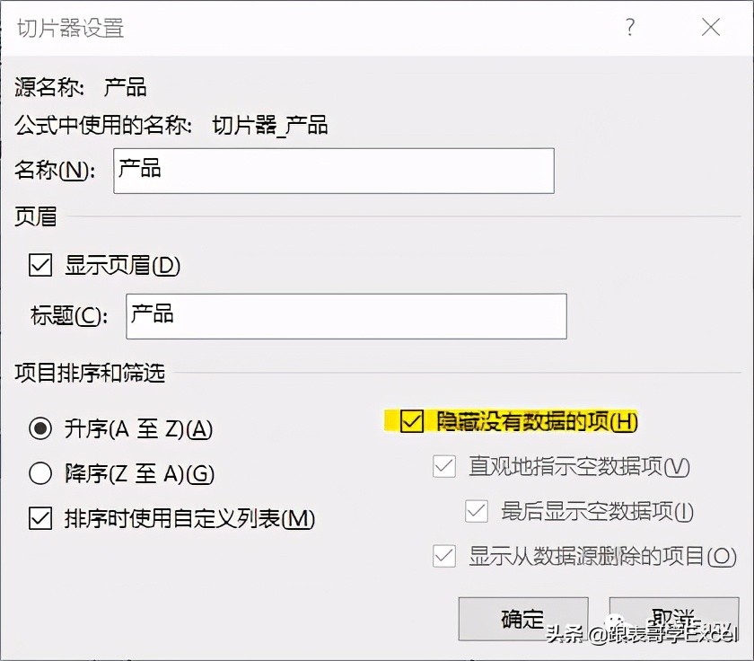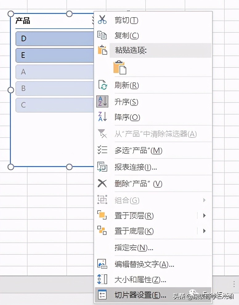 在产品切片器上,点击鼠标右键,点击“切片器设置”: