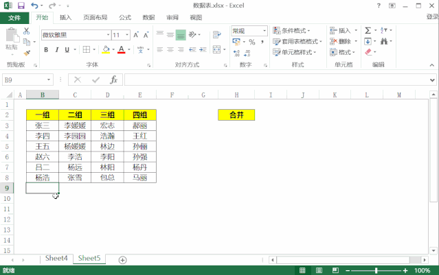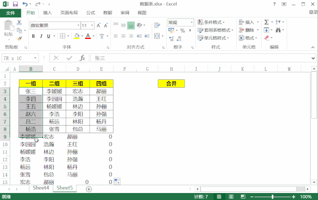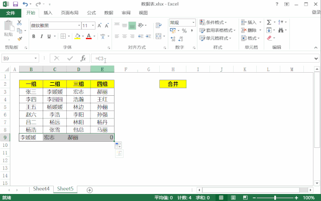 如上图所示,我们需要将一组到四组的姓名合并为右边的一列中。数据量较大的时候,我们用复制粘贴就会比较麻烦,下面我们来学习一个快捷操作,利用简单的一个=号,实现数据合并。