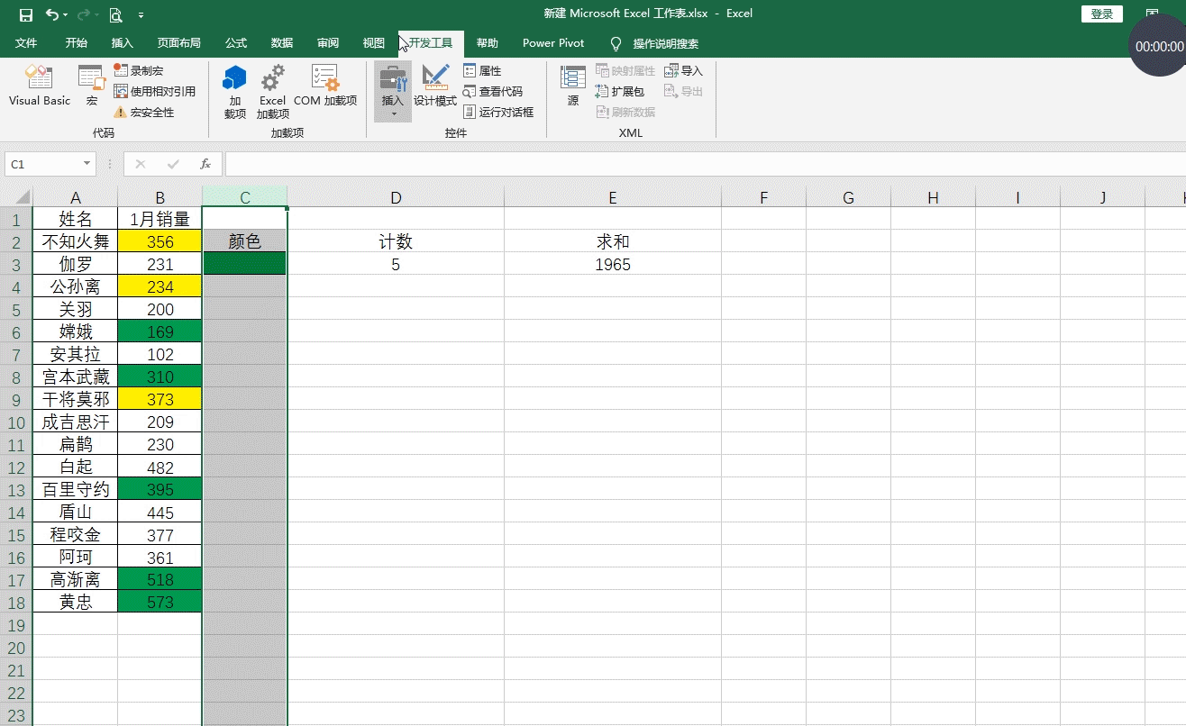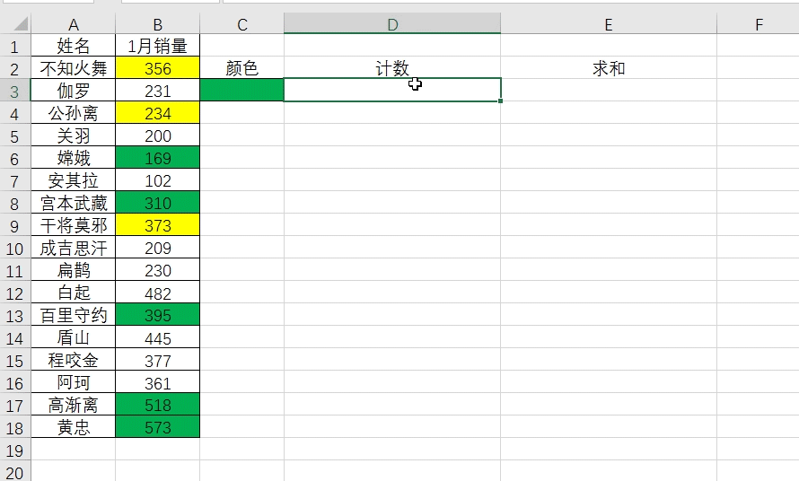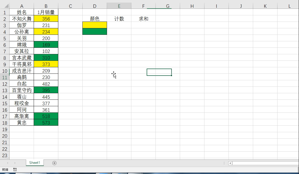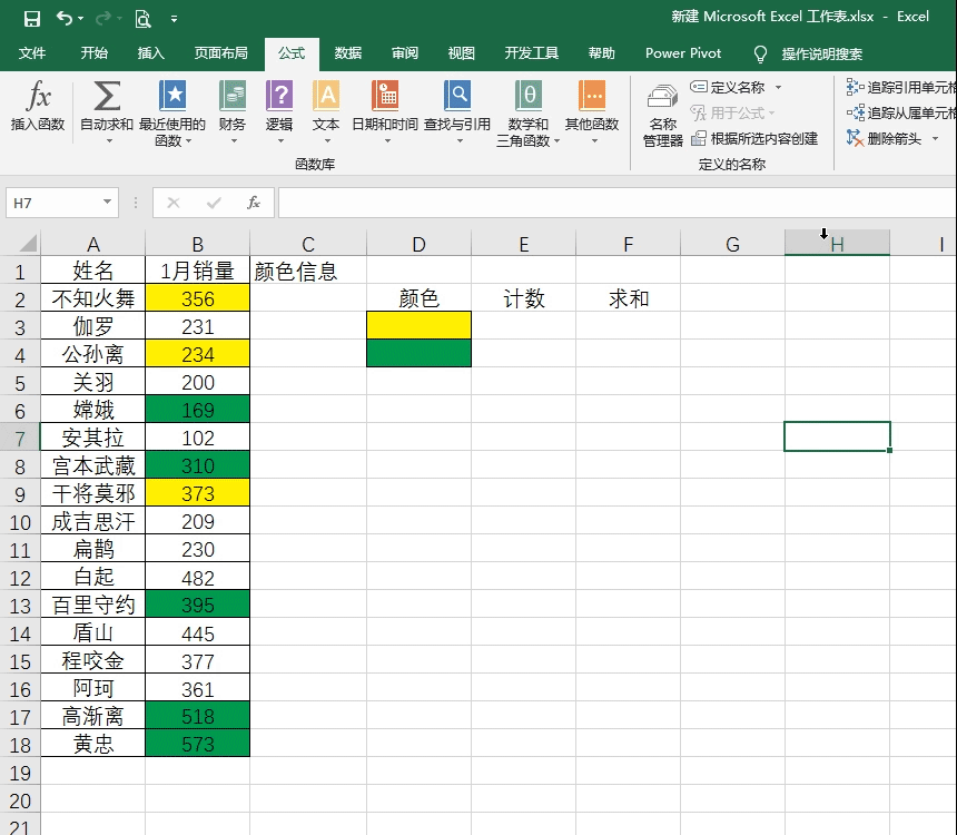 在这里我们自定了了两个函数,根据颜色求和的函数名称是SumColor,根据颜色计数的函数名称是CountColor