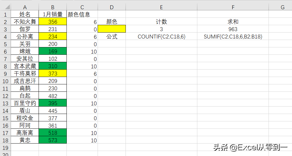 然后我们直接输入等于颜色,然后向下填充数据,就会根据不同的颜色返回不同的结果,黄色的结果为6.绿色的结果为10