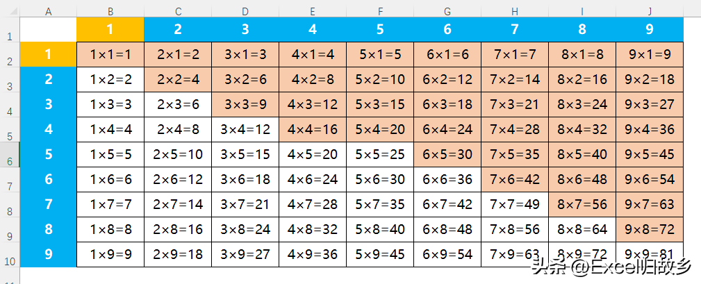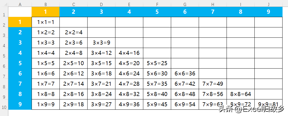 大家好我是Excel归故乡,本期我们将用上期学习的单元格的引用知识来用一条公式做一个九九乘法表,如果大家能够学会制作这个表,那单元格的引用基本上就学懂了。下图是我们将要用一条公式得到的结果:
