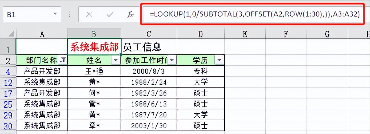 LOOKUP(1,0/SUBTOTAL(3,OFFSET(A2,ROW(1:30),)),A3:A32):返回筛选项。