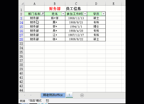 对“部门名称”进行筛选,选定的部门,名称会显示在B1单元格。