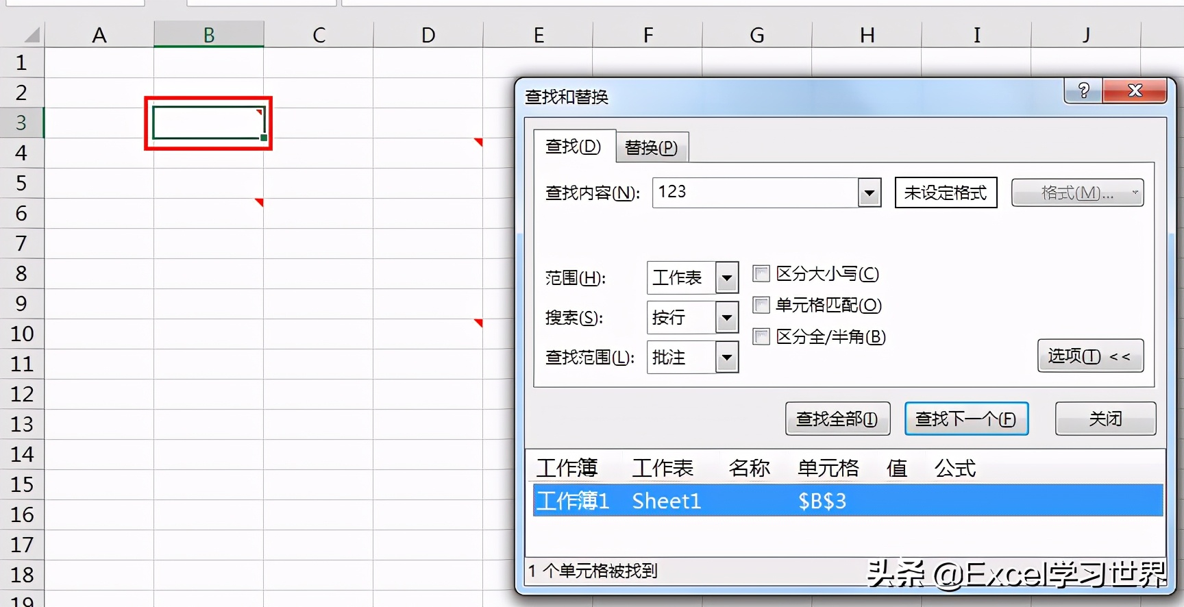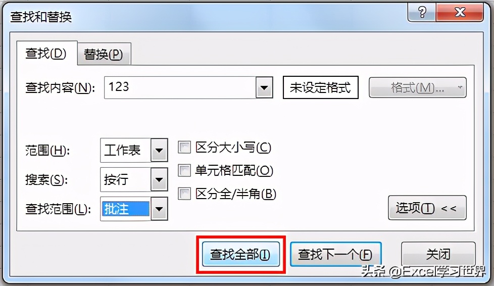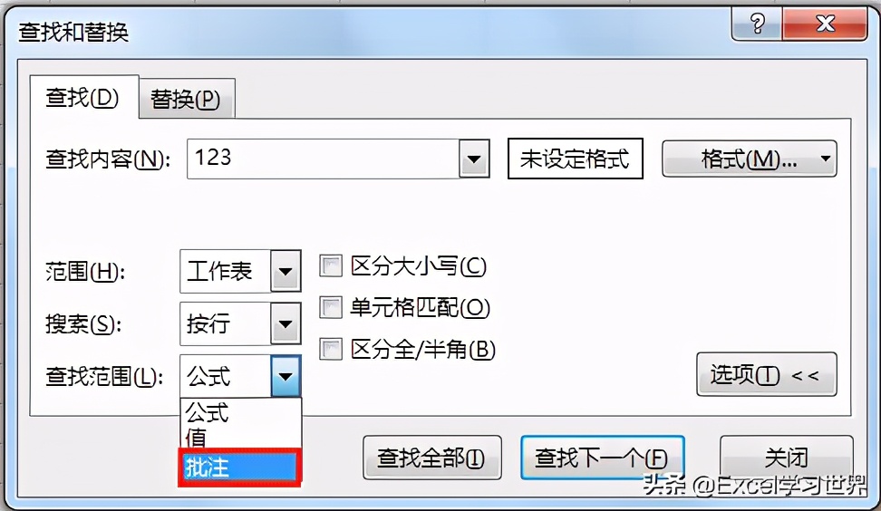 2) 在“查找范围”下拉菜单中选择“批注”--> 点击“查找全部”