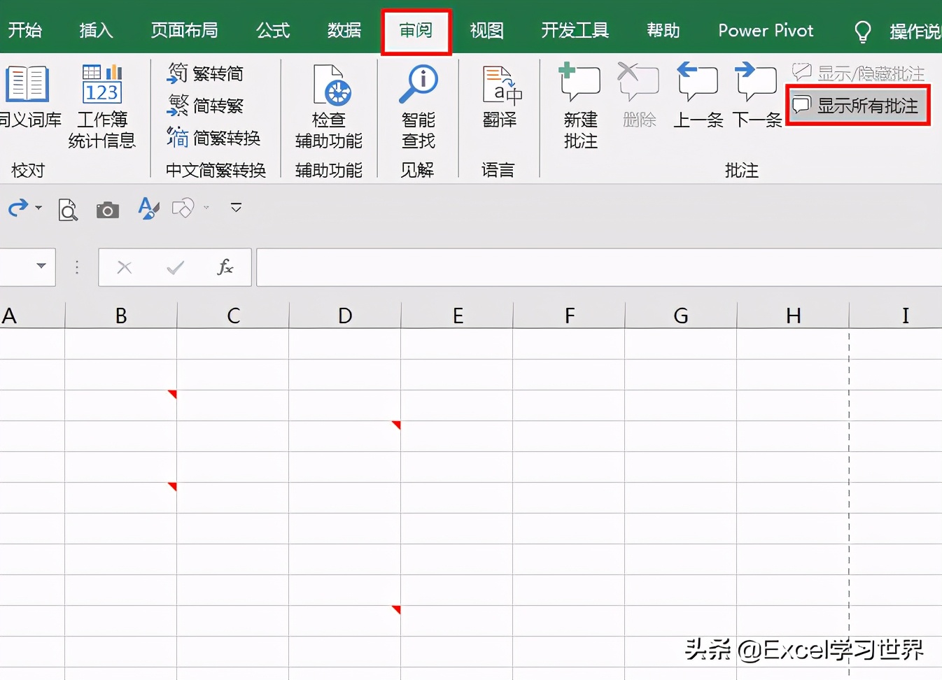 1) 选择菜单栏的“审阅”-->“显示所有批注”