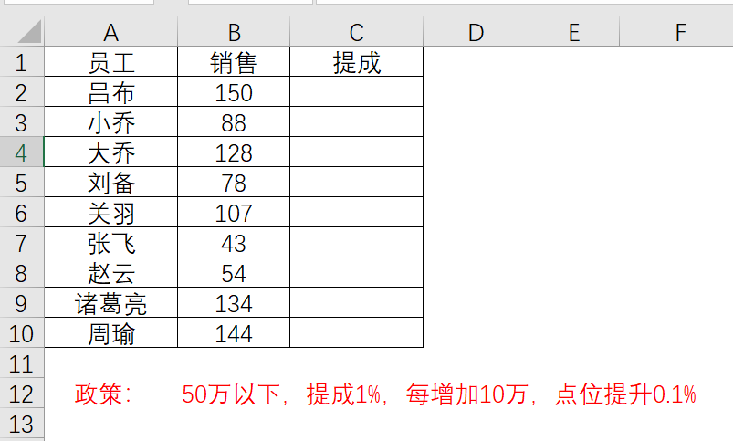 某公司制定了一个竞赛方案,其政策是:销售额在50万以下,提成1%,然后每增加10万,提成点位提升0.1%,现在需要根据每个员工的销售额,来核算他们的提成情况,如下所示: