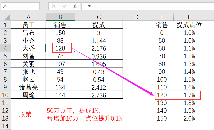 如大乔的业绩是128,那么它会在E列里面模糊查找,找到E列中最接近于128的值,并且是不超过128的这个值,也就是找到<=128最接近的数字,在E列里面找到是120,返回的结果就是120向右数第2个的结果(VLOOKUP第3个参数是2)1.7%,那么1.7%*128=2.176
