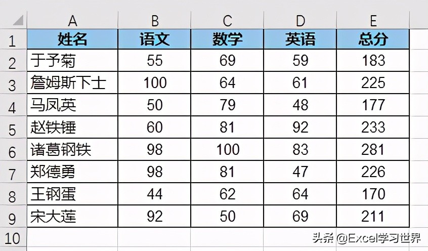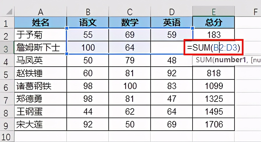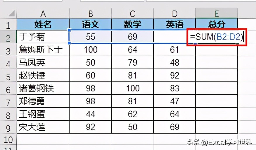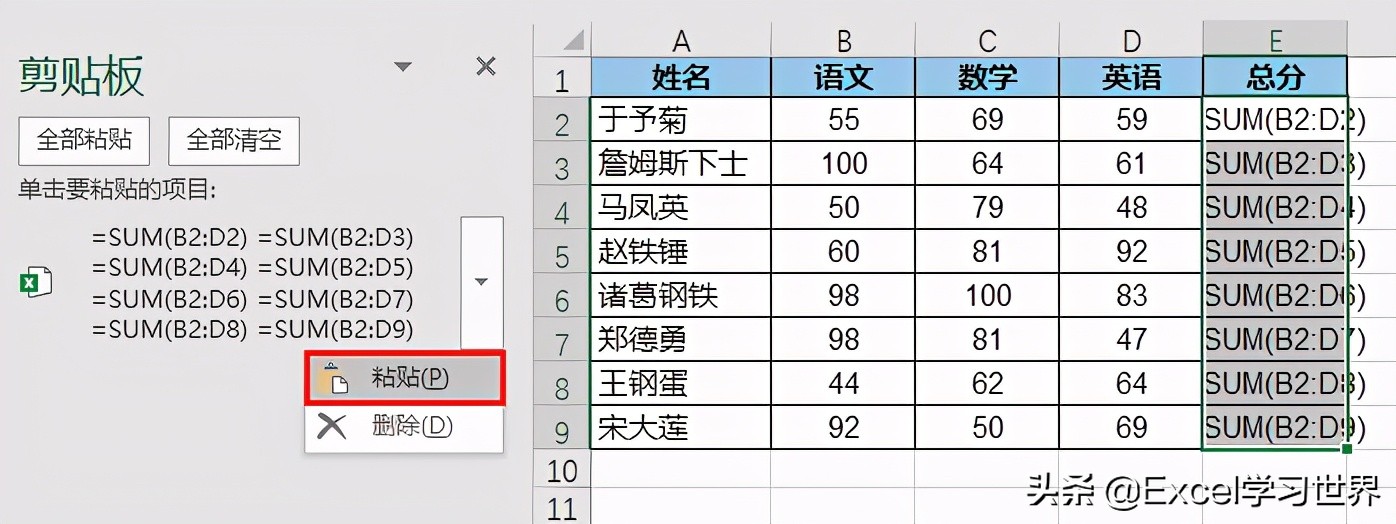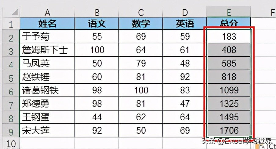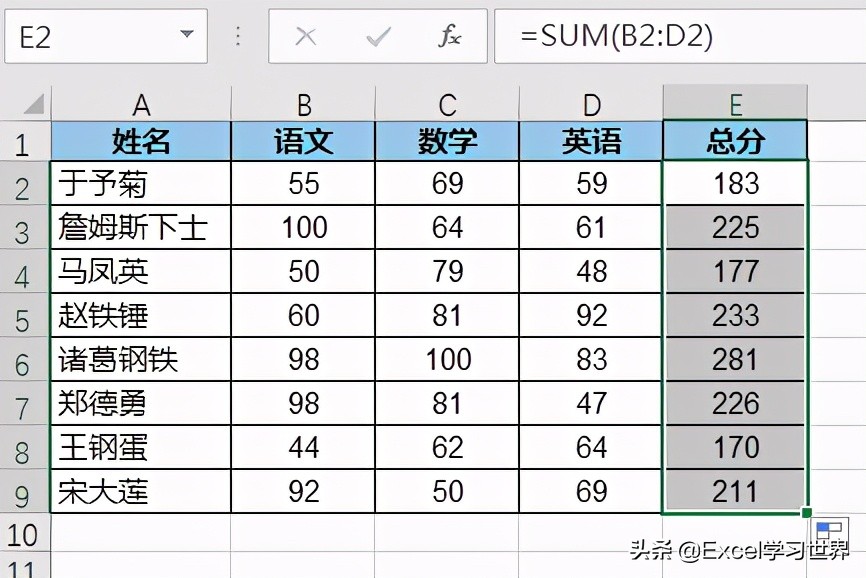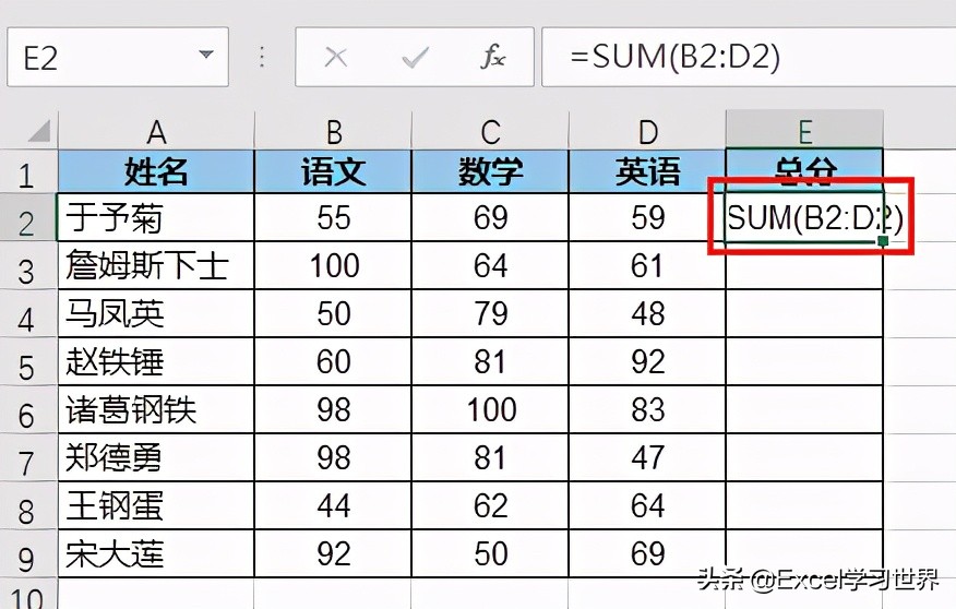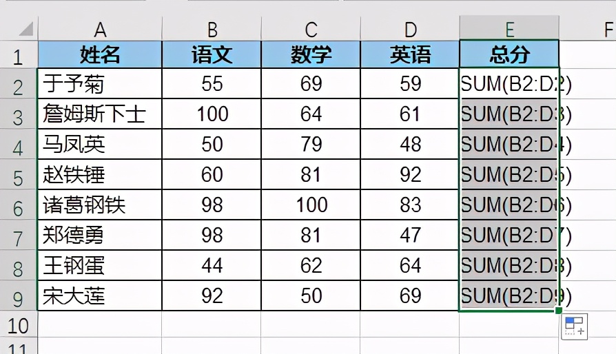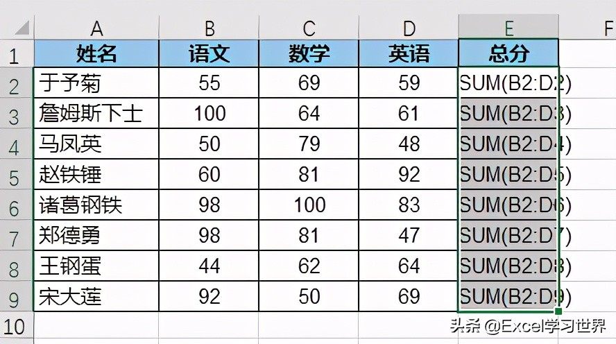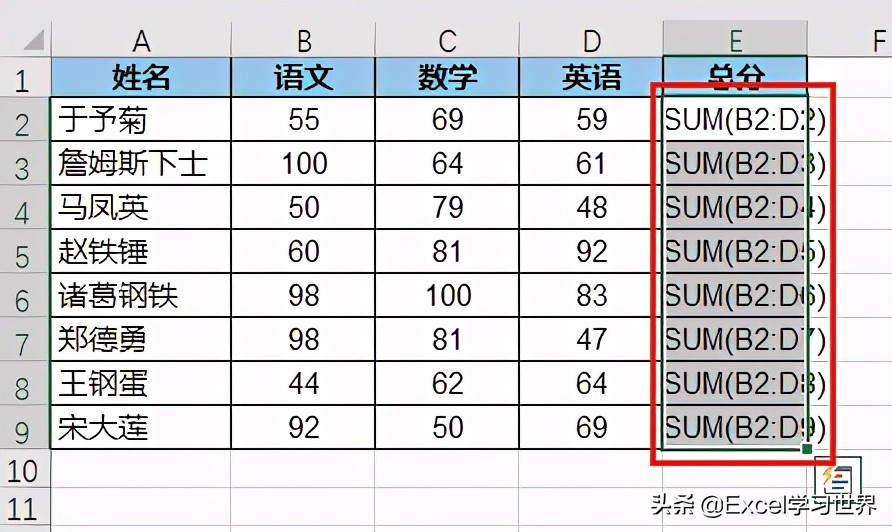 下图 1 是班级各位同学的考试分数,需要在 E 列计算出总分,但是输入公式下拉后,单元格内显示的是算式而不是结果,请修复。