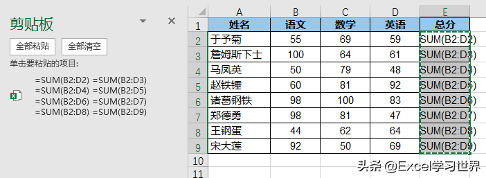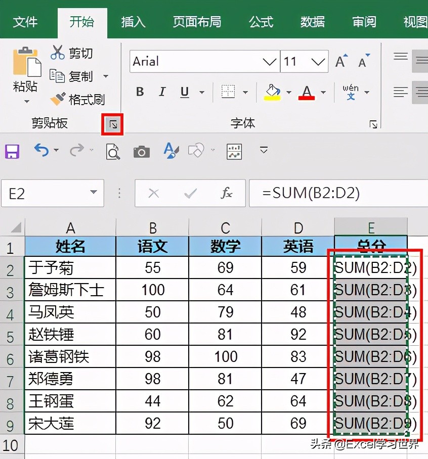 4. 复制 E2:E9 区域 --> 选择菜单栏的“开始”--> 点击“剪贴板”右下角的小箭头