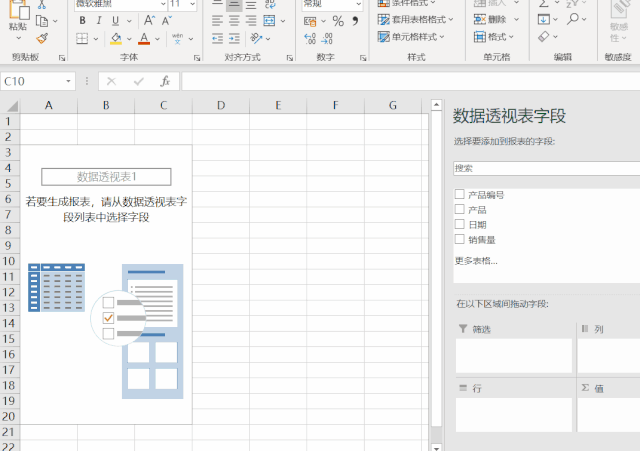 ❷ 将日期拖入「行标签」,产品拖入「列标签」,销售量拖入「值」;