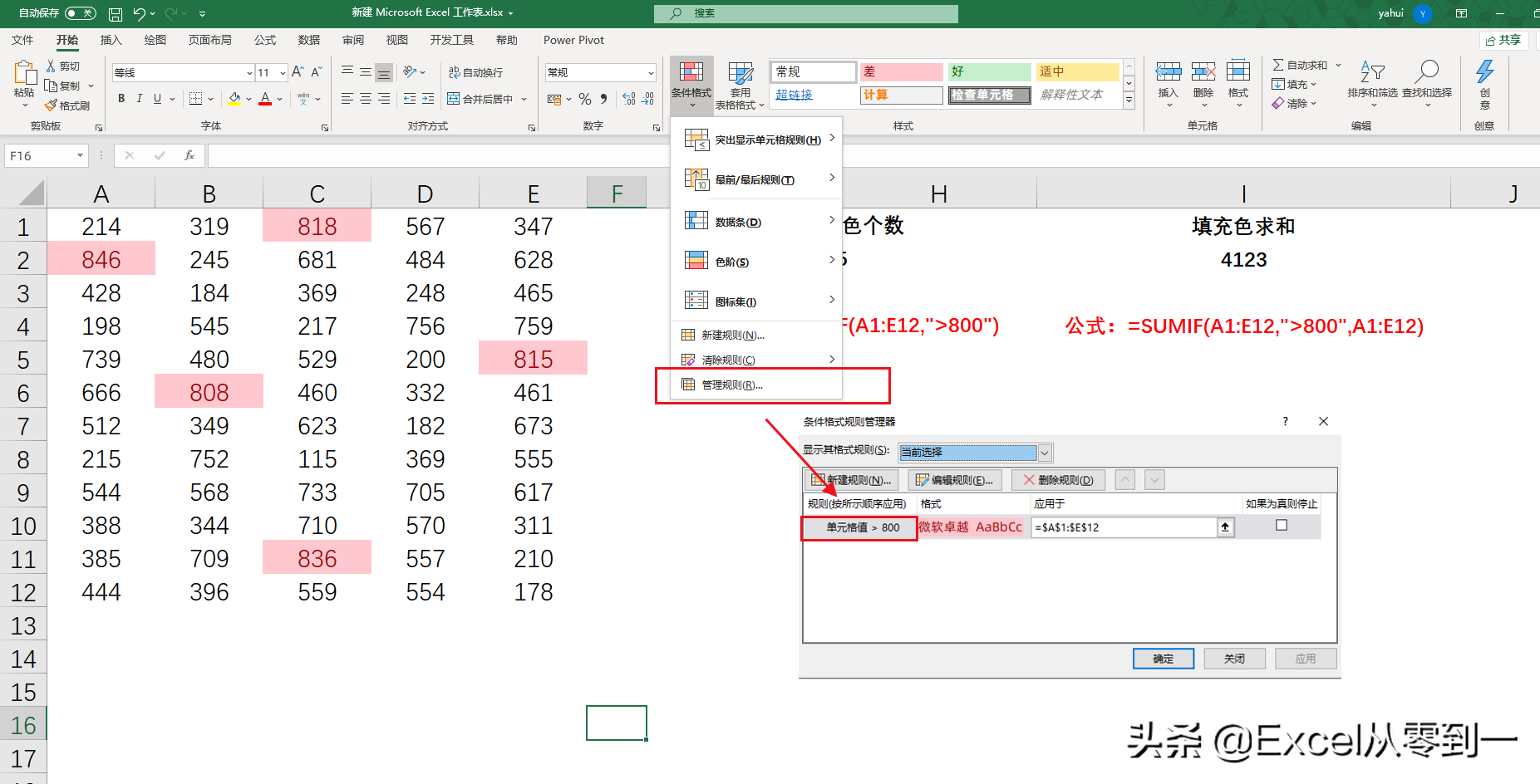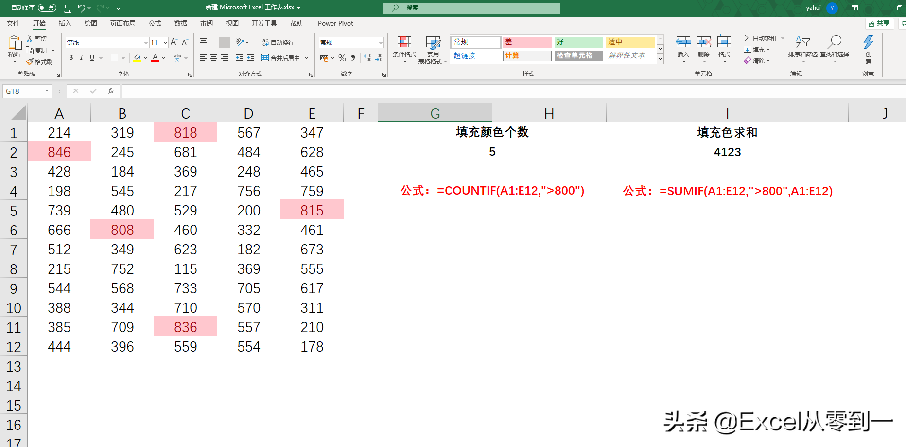 对填充色计数的公式为:=COUNTIF(A1:E12,">800")