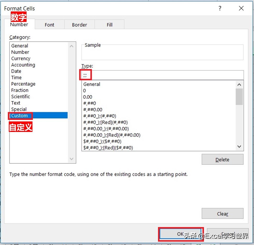 3. 在下一个对话框中选择 Number(数字)选项卡 --> Custom(自定义)--> 在右边的类型中输入“;;;”--> OK: