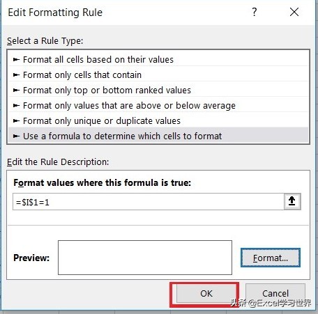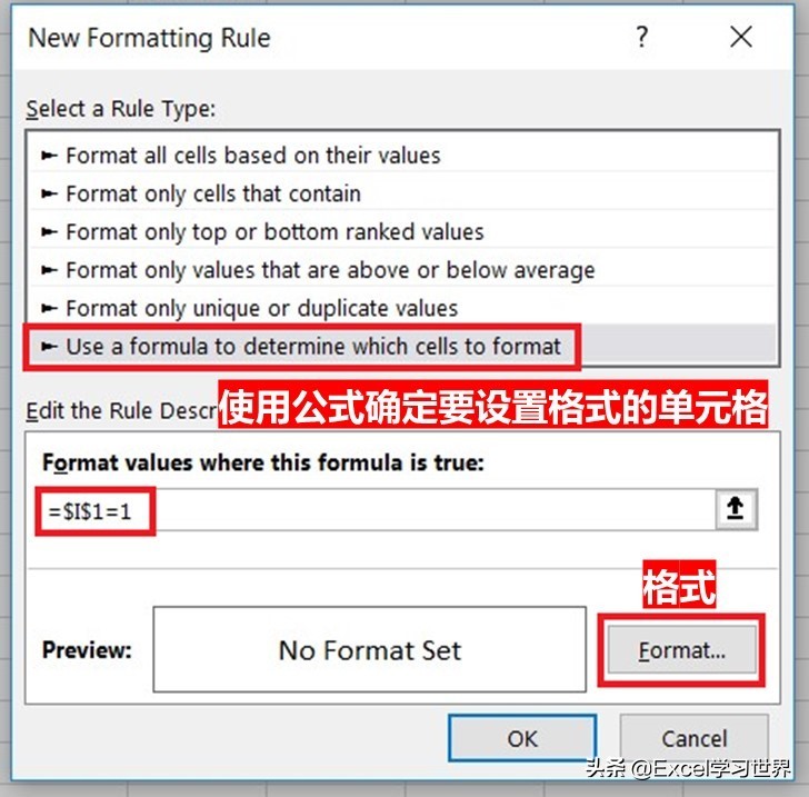 2. 在弹出的对话框中选择最下底下一个选项 Use a formula to determine which cells to format(使用公式确定要设置格式的单元格)--> 在公式区域输入 =$I$1=1 --> 点击 Format(格式)按钮