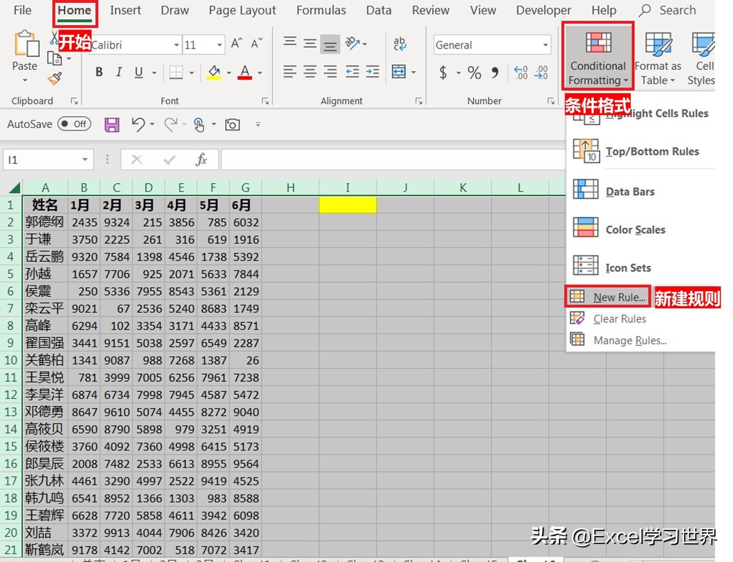 1. 全选所有单元格 --> 选择菜单栏的 Home(开始)--> Conditional Formatting(条件格式)--> New Rule(新建规则)