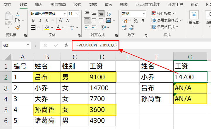 举个工作中的例子,左表是员工工资表数据,我们需要查找匹配数据员工的工资数据,我们在G2单元格中,输入的公式是: