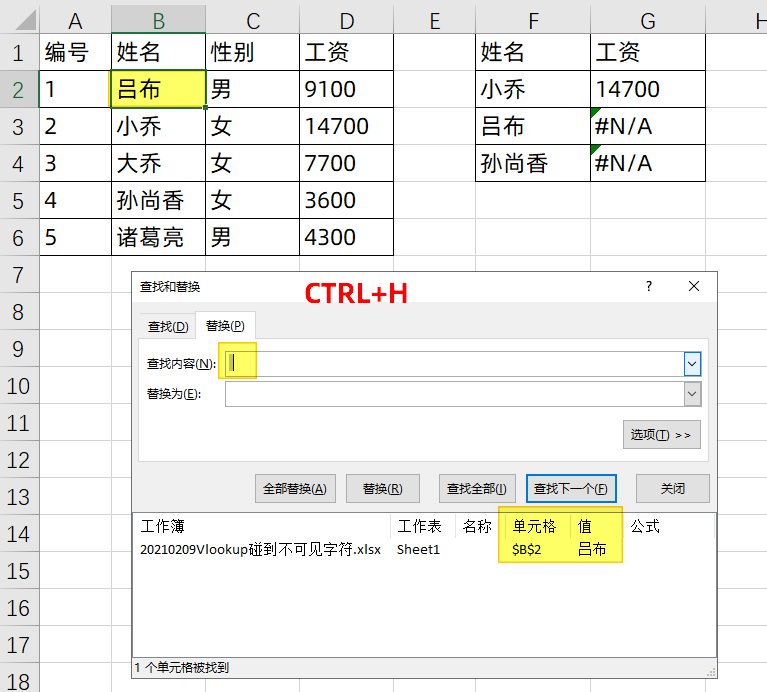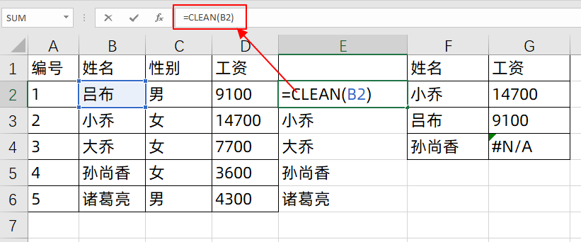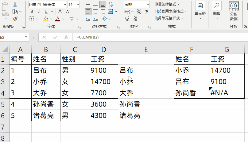 我们通过查找空格,吕布已经可以查找出来了,但是孙尚香还是查找不出来,也不是因为空格的原因,这个时候,我们可以检查其他不可见字符,如果确定不了非可见字符在查找值,还是在查找列,我们就使用clean函数对查找值,及查找列数据都进行清洗