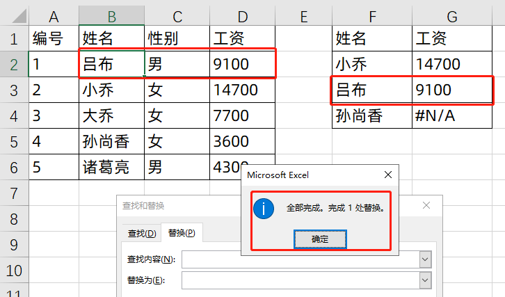 所以导致吕布这个数据查找失败了,我们在替换为里面不输入任何内容,然后点击全部替换,这样把表格里面的所有空格给替换掉