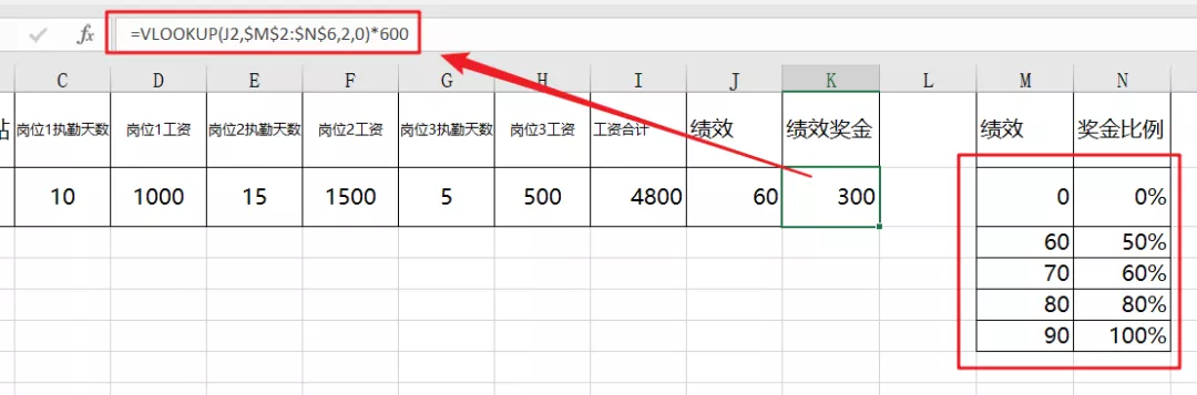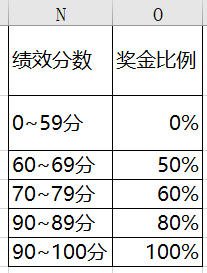 全额奖金 600 元,根据下面的规则,不同的绩效,奖金比例不同,怎么快速计算出对应的奖金?