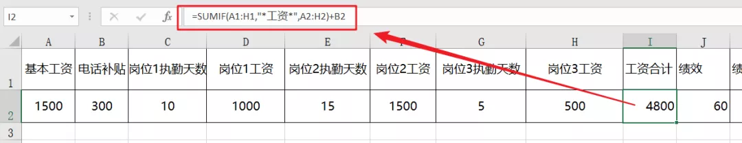 =SUMIF(A1:H1,"*工资*",A2:H2)+B2
