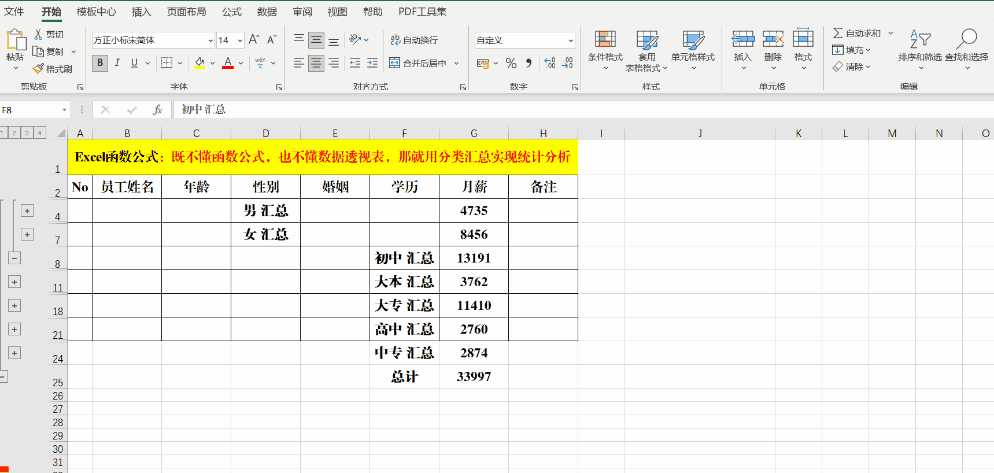 出现了2个“初中汇总”和2个“大专汇总”……,很显然不是我们想要的结果,但操作方法无误,原因何在???