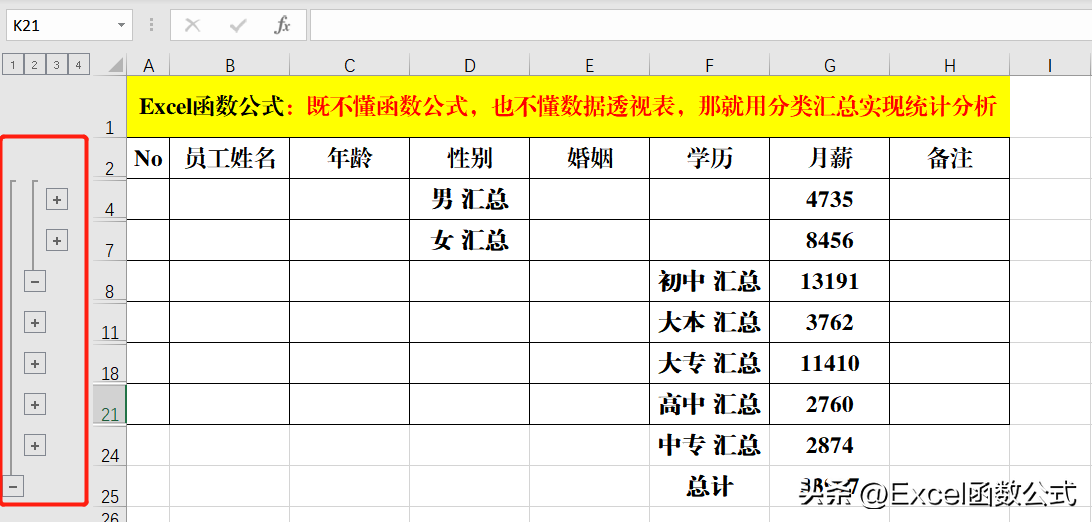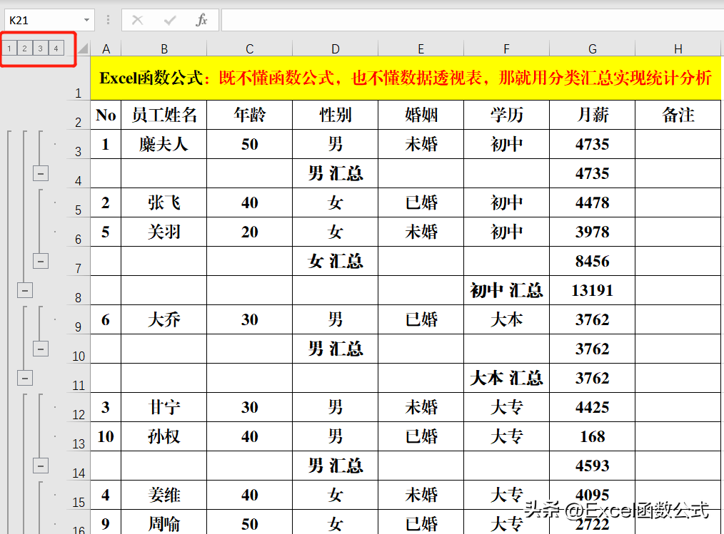 在对数据进行汇总之后,在A1单元格的左上角会形成一行数字1、2、3、4……等,这些数字代表“类”,数值越小,“类”越大,数值越大,“类”越小。如上图中的“4”就代表明细,“3”就是按“性别”汇总,“2”就是按“学历”汇总,“1”就是总值。