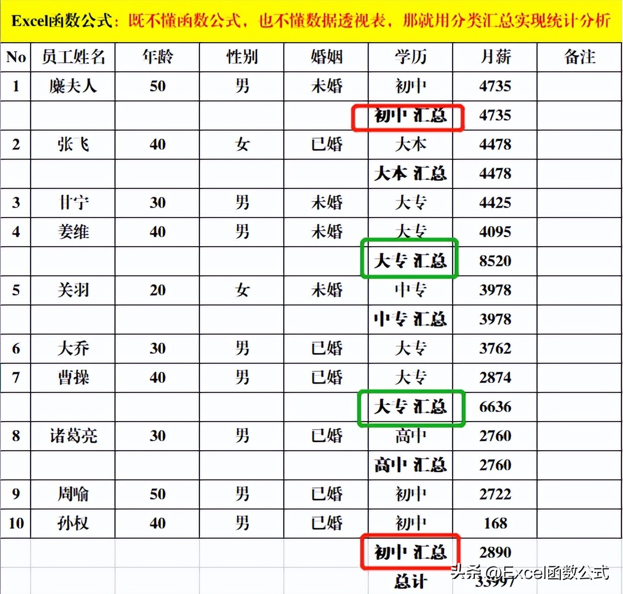 究其原因就是没有先“分类”,而直接进行了“汇总”,具体来讲就是没有将相同“学历”的值放置在一起,所以系统在判断时如果临近行的字段相同,就进行“汇总”,如此反复,就出现了多个“初中汇总”、“大专汇总”等。