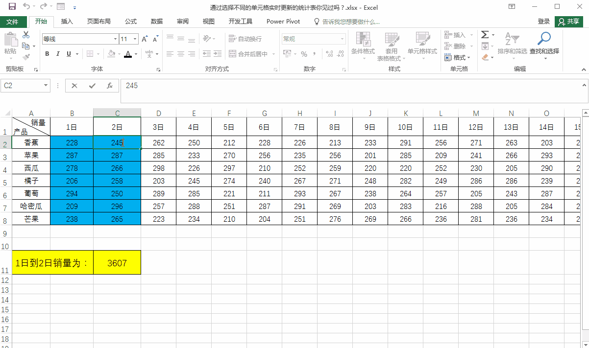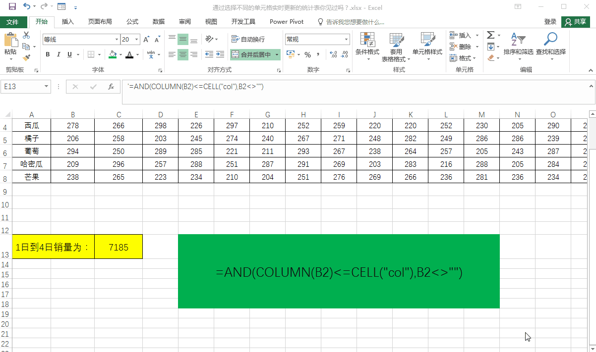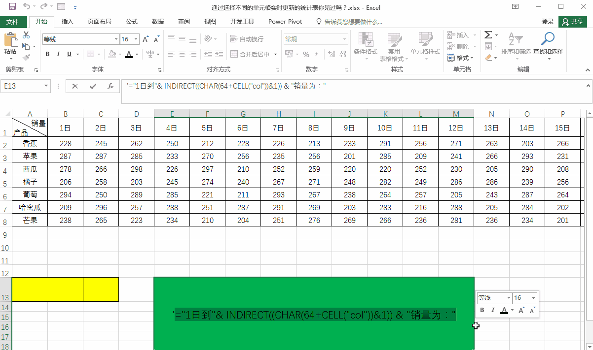 1.选择日期或日期所在列的任意单元格双击,A13单元格的内容和B13单元格的销量就会实时更新。
