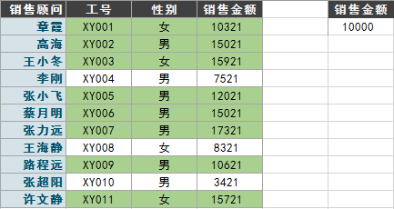 我们还可以设置条件,让满足条件的所有数据全部变色。比如这里我们让销售金额大于10000的数据行都显示绿色。