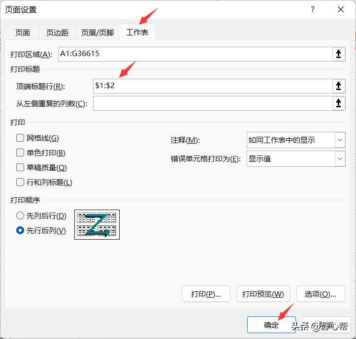 2 在打开的【页面设置】对话框中,在【工作表】选项卡下设置【打印标题】中的【顶端标题行】为:$1: $2,即第1-2行的意思,单击【确定】按钮。