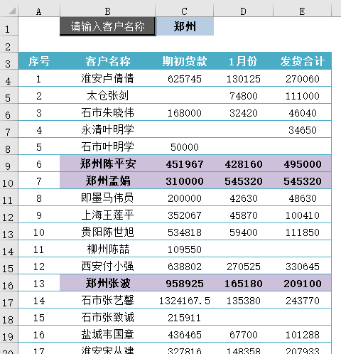在客户往来货款表中,只要输入客户名称的关键字,Excel就会自动高亮显示对应的记录,核对数据是不是要简单好多啊。