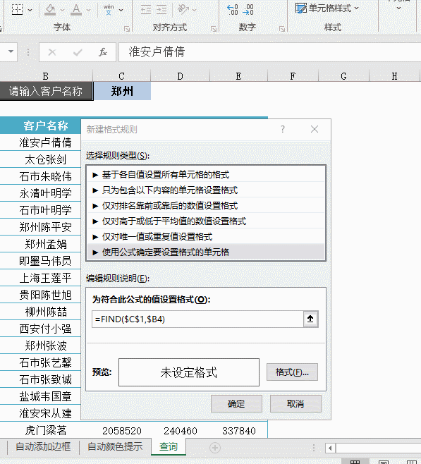 在条件格式中使用公式时,如果公式结果是不等于0的数值,则相当于逻辑值TRUE,此时Excel会按照咱们预先设置的格式效果进行显示。如果公式结果等于0或是错误值,Excel就不会执行条件格式预设的规则了。