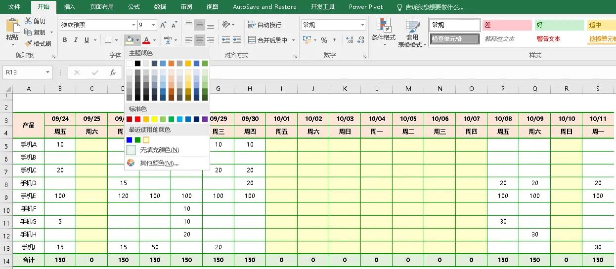 当然我们可以通过选择 C5:C13, I5:O13, R5:R13 范围后, 通过选择颜色的方式给区域增加上颜色, 如下图