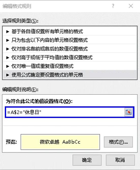 3. 选择 "使用公式确定要设置格式的单元格", 并在规则中输入 =A$2=”休息日”, 点击确定