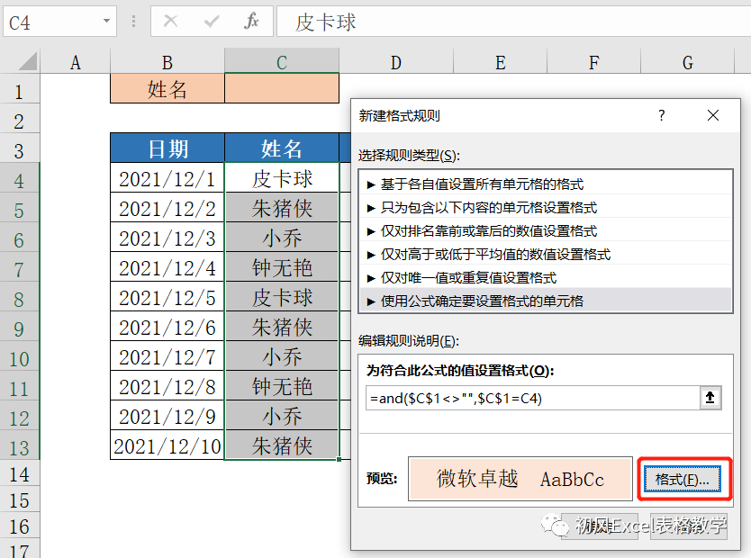 如下图所示,选择【使用公式确定要设置格式的单元格】,输入公式:=and($C$1<>"",$C$1=C4)。
