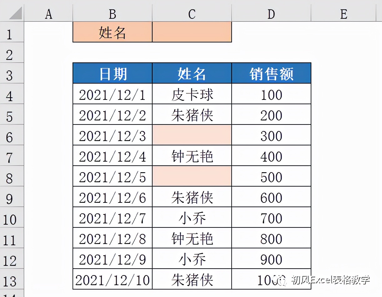 单击确定后,结果如下图所示,即使没有在C1单元格中输入姓名,C4:C13中的空单元格高亮显示。