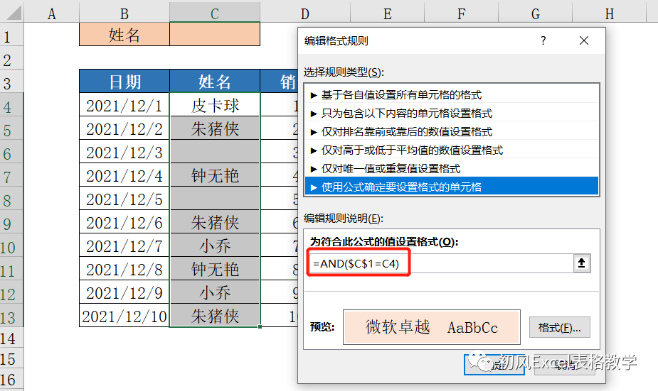 (2)and($C$1<>"",$C$1=C4)表示如果C1单元格不为空值,且C1单元格的姓名与C4单元格相同,则返回True,否则返回False。