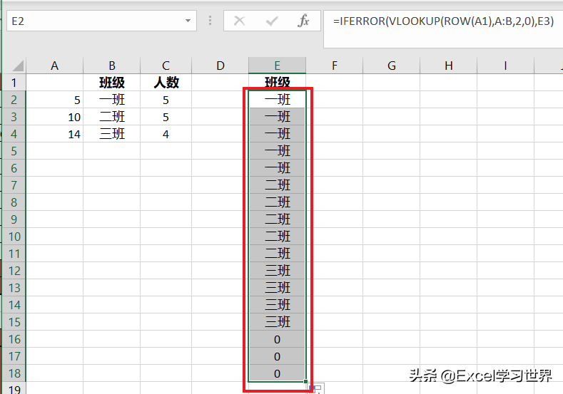 下图 1 为“班级”、“人数”对照表,现在需要在同一列中,根据人数重复显示班级名,比如一班有 5 个人,就重复显示 5 行“一班”,然后再按人数重复显示“二班”,以此类推。效果如下图 2 所示。
