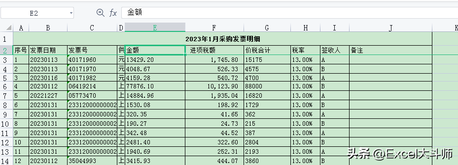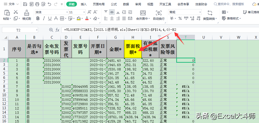 2.[2023.1进项税.xls]Sheet1!$C$2:$F$14——发票登记表的数据范围,选择范围的第一列必须是发票号码所在的列(C列),范围里要包括税额进去