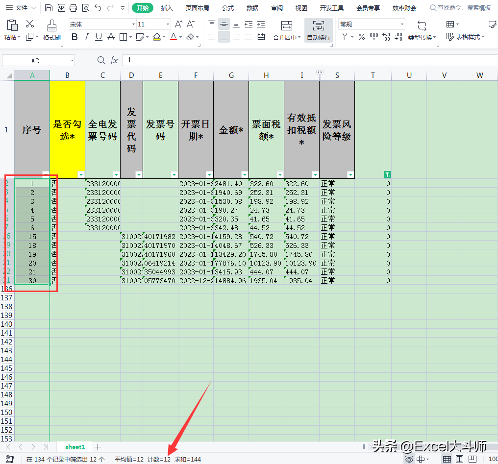 再看勾选发票的张数与我们登记的发票张数是否一致,一共12张,登记也是12张,一致,取消筛选,删除公式列,回到发票勾选平台,点清单导入勾选即可