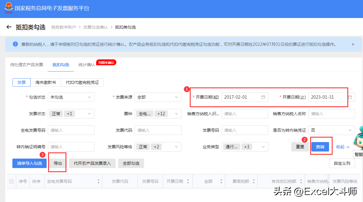 首先,收到的增值税专用发票需要登记电子档,还有少量的全电发票,登进电子税务局勾选平台,设置好查询日期范围,点查询,导出Excel文档