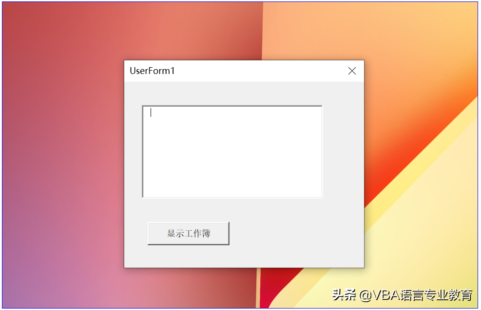 由于实现这个目的的思路比较简单,就不再进行思路的讲解,我们看代码的搭建部分,由于进入工作簿后只显示窗体,我们无法进行后续的测试及进入VBE窗口,我们先在窗体上增加一个按钮: