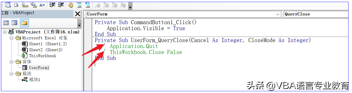代码解读:此处的代码让我们在只显示窗体的界面条件下可以进入工作簿,同时大家要注意屏蔽原有代码中关闭工作簿时不保存退出代码,如下: