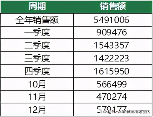 10月-12月累计等于四季度,一季度-四季度累计等于全年销售额,用柱状图的纵向长短表示大小,给人以直观上的感受。