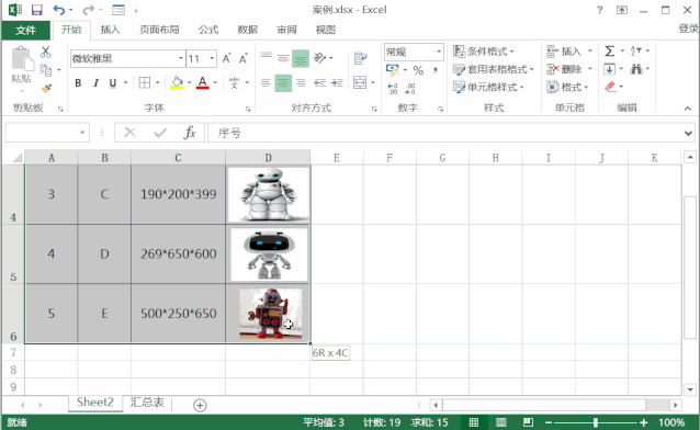 第三步:因为我们的目标单元格行高和列宽跟原始的数据不一致,所以粘贴到汇总表中后图片大小我们需要重新批量进行调整到合适的大小。选择全部单元格区域,直接批量拖动行高和列宽,这样图片也会自动跟随发生变化。如下图所示: