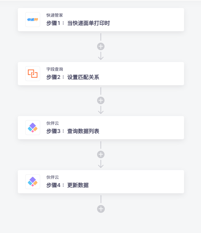 达成效果:通过集简云,每当快递管家打印面单时,自动查询该订单在伙伴云的数据,并更新相关快递公司、快递编码等信息。无需人工再一一手动录入,省时省力,提升工作效率。