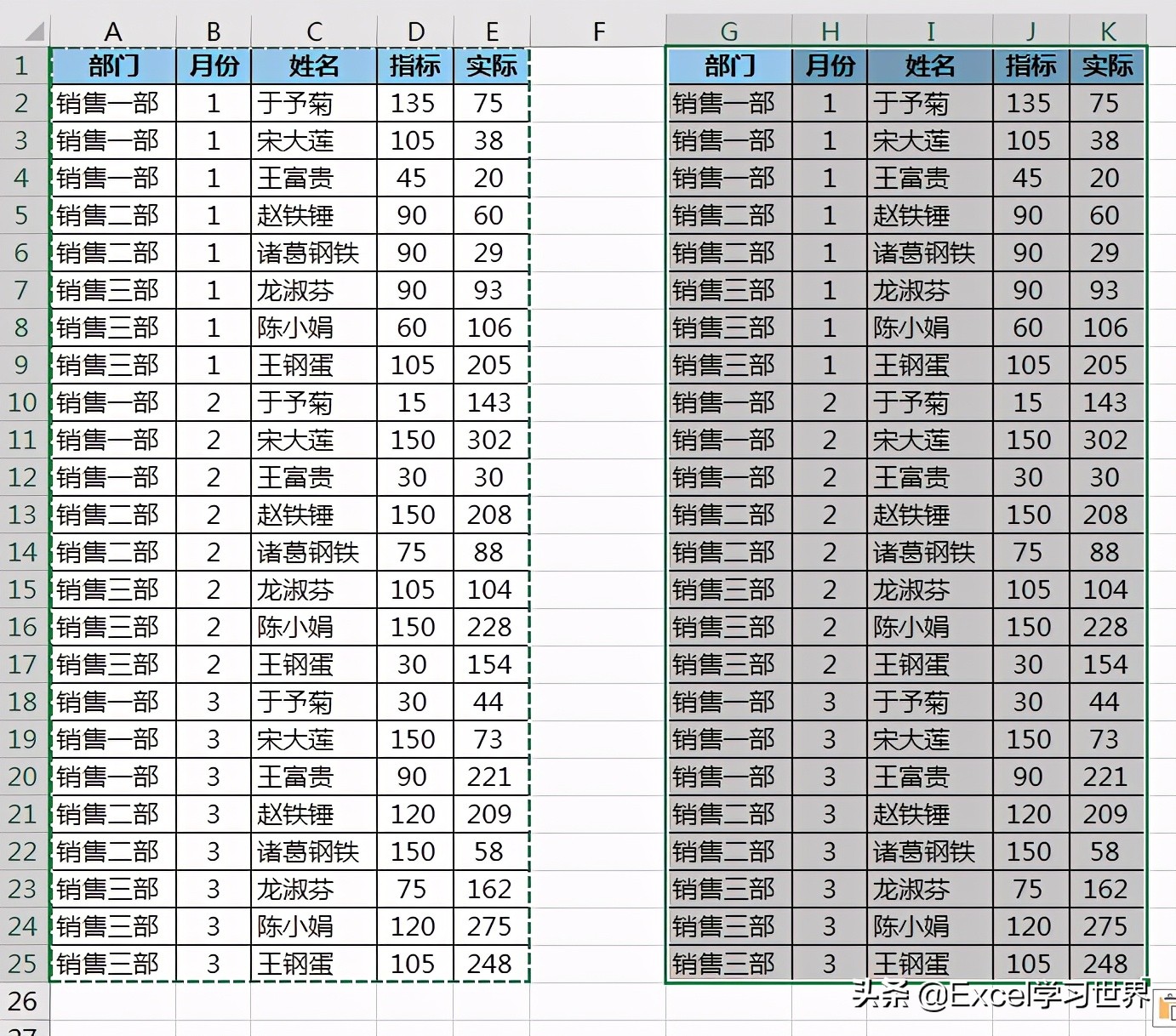 1. 选中 A1:E25 区域 --> 复制、粘贴到 G1:K25 区域