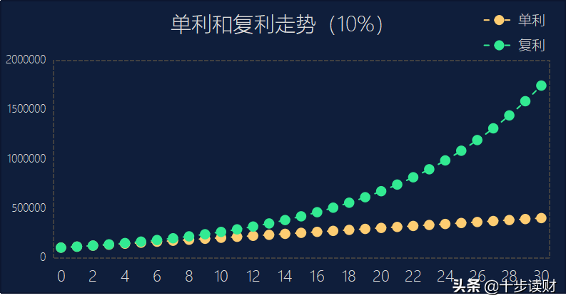 利率是10%时,单利终值40万,复利终值175万,复利比单利高出300%……