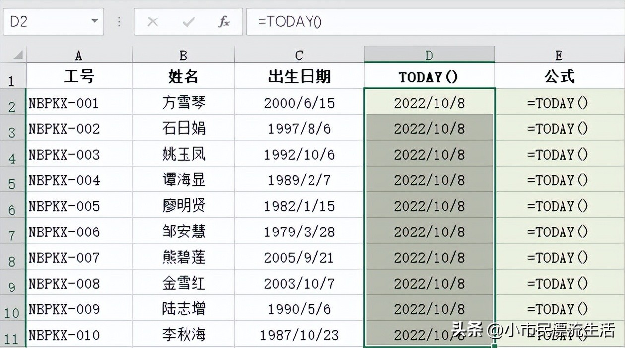 案例公式 =IF(MONTH(C2)=MONTH(TODAY()),"是","") 解析,其中 =TODAY() 部分获取当前日期 2022年10月8日,如下图