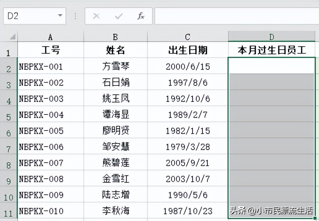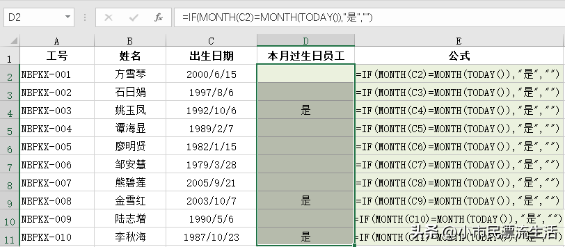 选中D2单元格输入公式 =IF(MONTH(C2)=MONTH(TODAY()),"是","") ,按enter键运算公式,ctrl+c复制D2单元格公式,再选中D3:J11单元格区域ctrl+v粘贴,完成D2单元格公式相对引用式粘贴,此时就统计出了本月过生日的员工。
